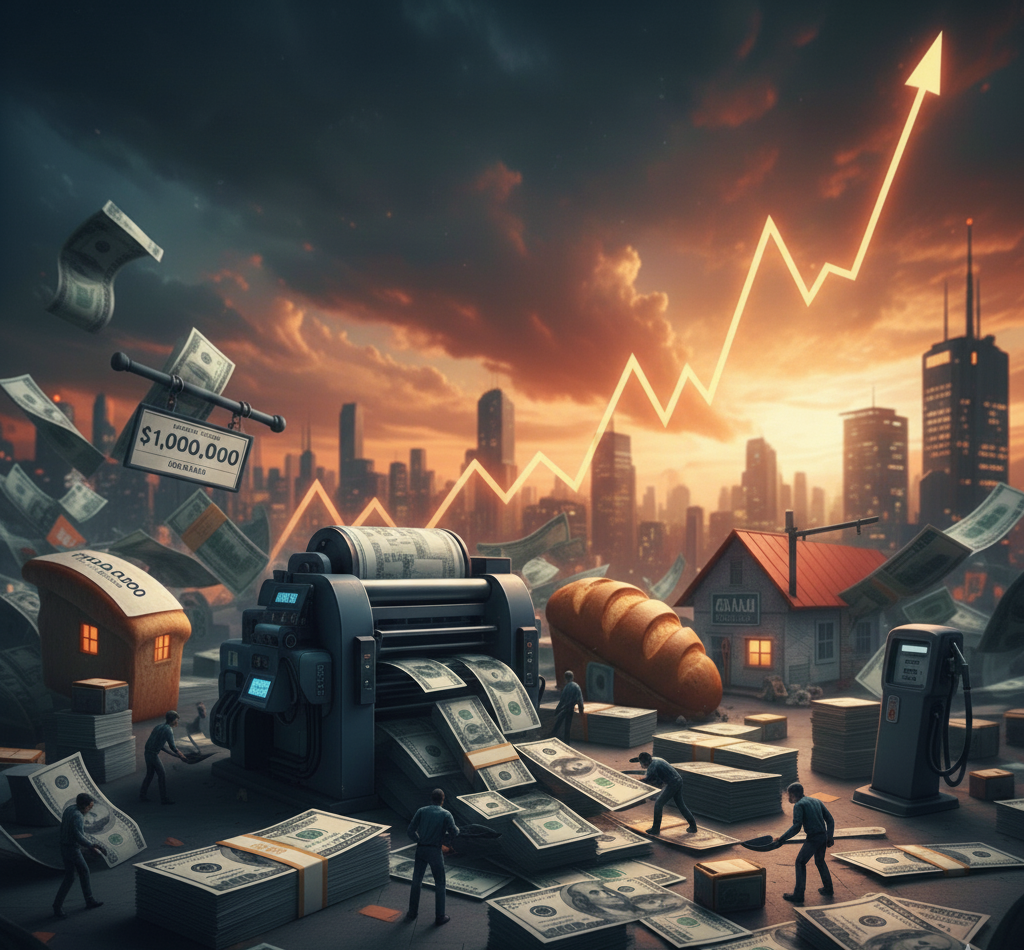 • معادلة القوة الشرائية: إذا تضاعفت كمية المال في يد الجميع فجأة دون زيادة في إنتاج السلع (مثل الخبز، السيارات، أو العقارات)، فإن النتيجة الحتمية هي ارتفاع جنوني في الأسعار.